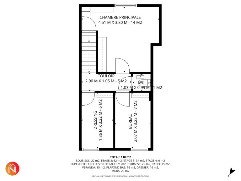 Un bureau de 6 m² et un dressing de 7 m² lesquels peuvent être rassemblés et devenir une vaste chambre supplémentaire.