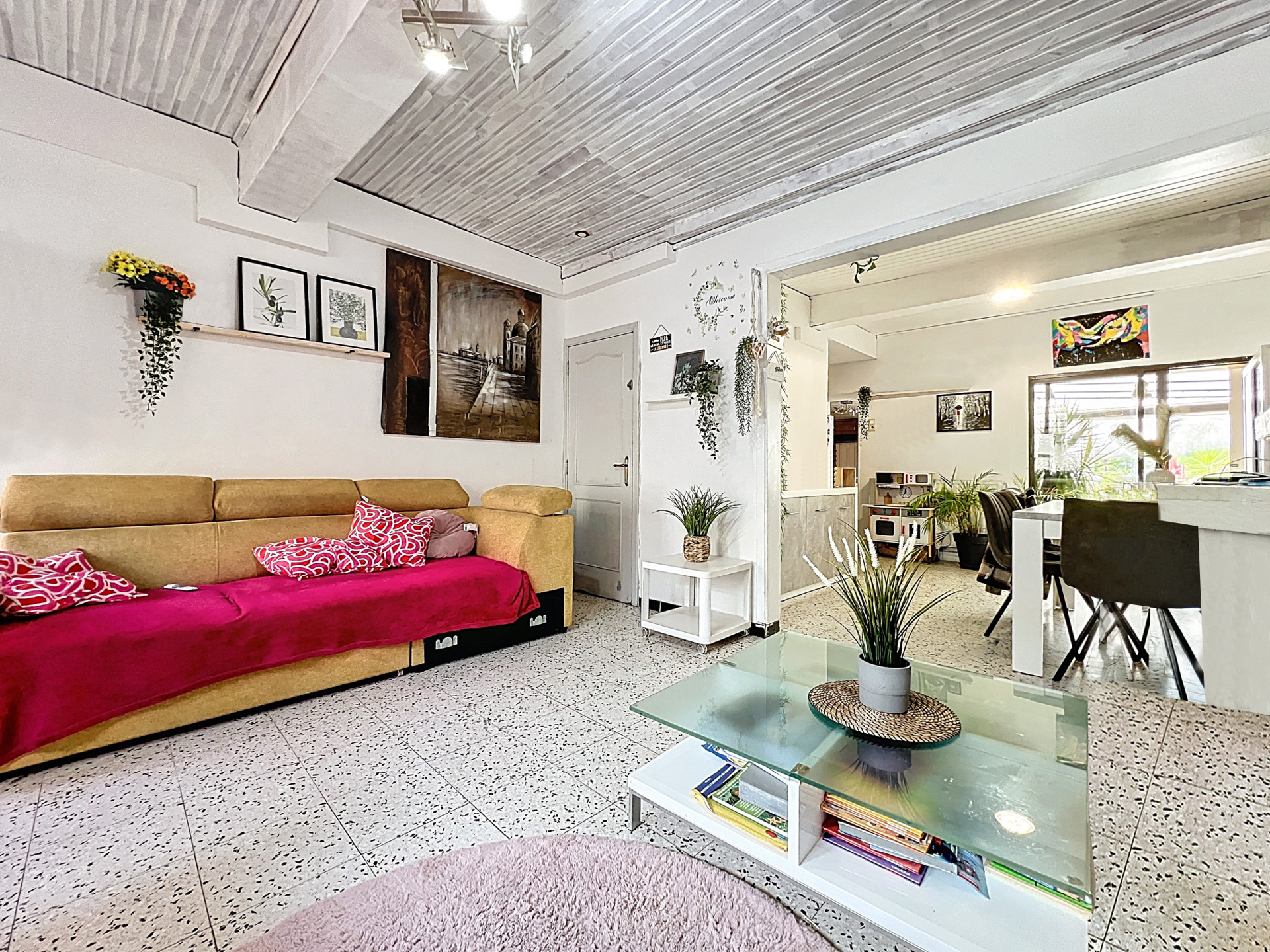 Séjour lumineux de 36 m² avec poêle à bois.