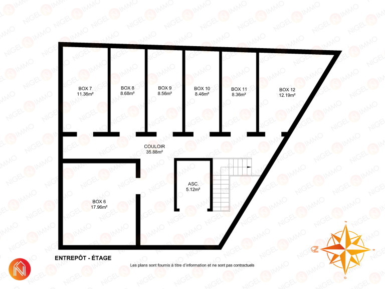 6 box de +/- 10 m², loués 140 €/unité/mois, soit loués l’ensemble pour 840 €