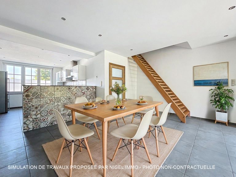 La cuisine équipée ouverte prolonge harmonieusement cet espace, idéale pour des moments conviviaux en famille ou entre amis.