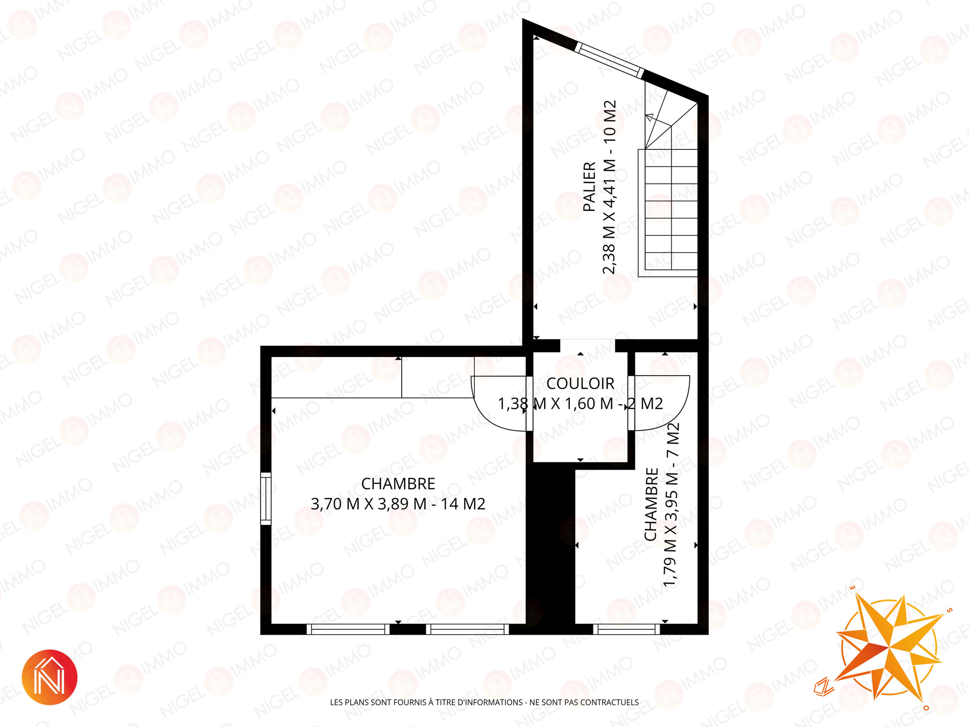 Palier spacieux de ± 10 m² desservant 2 chambres de ± 14 m² et 7 m²