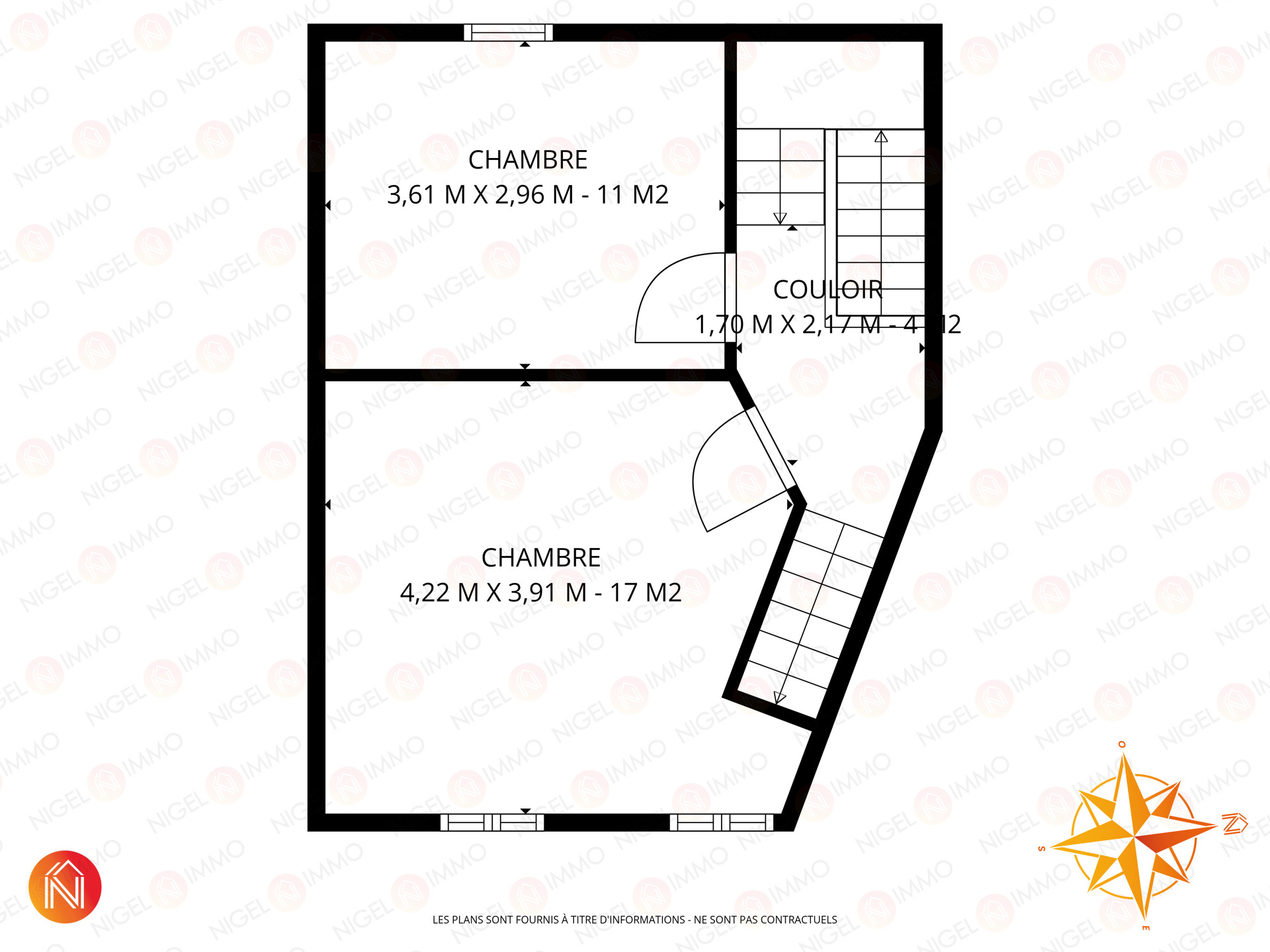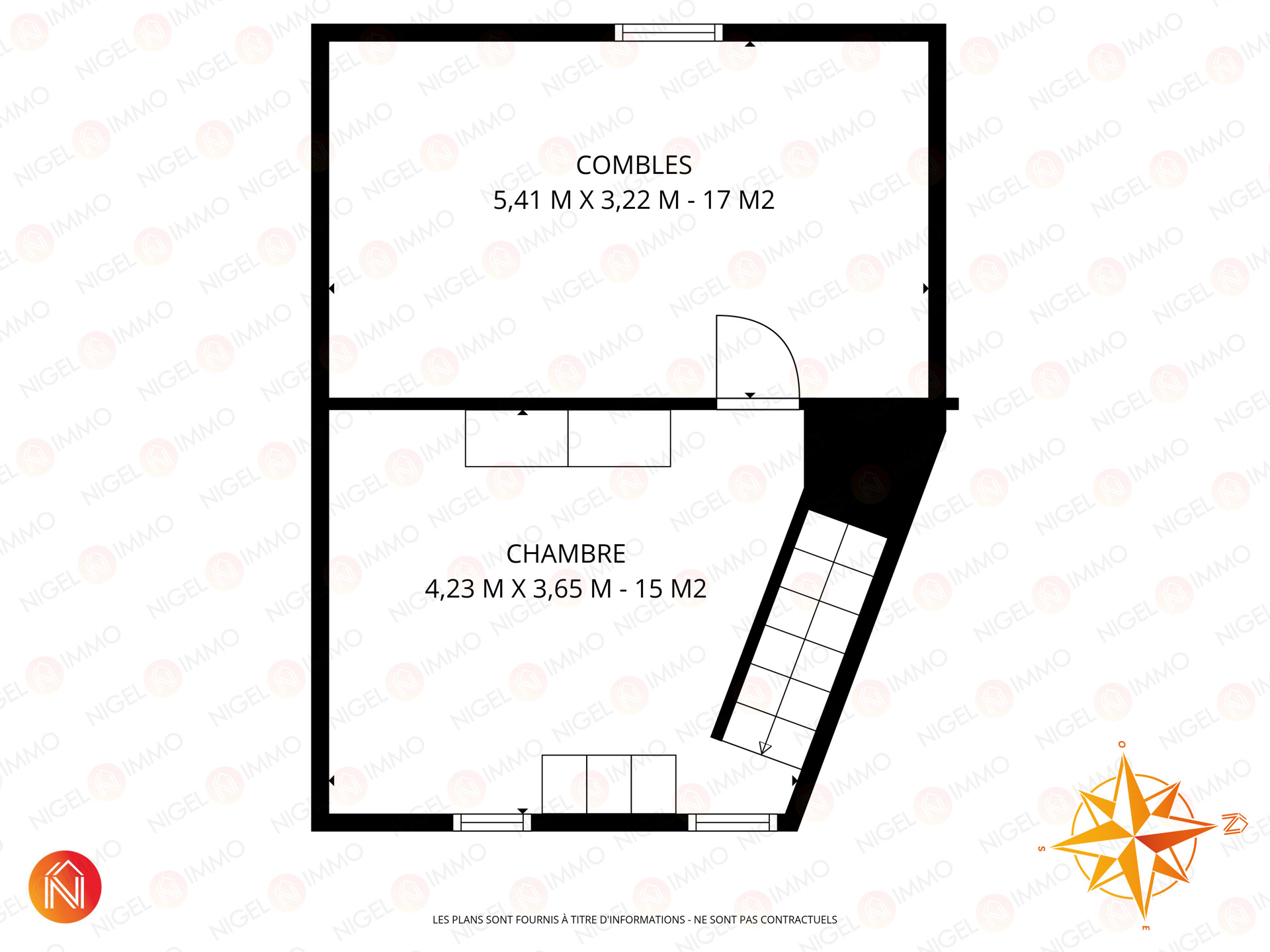 Au deuxième étage, deux vastes pièces supplémentaires de 17 m² et 15 m², idéales pour une chambre + un bureau ou un espace polyvalent.